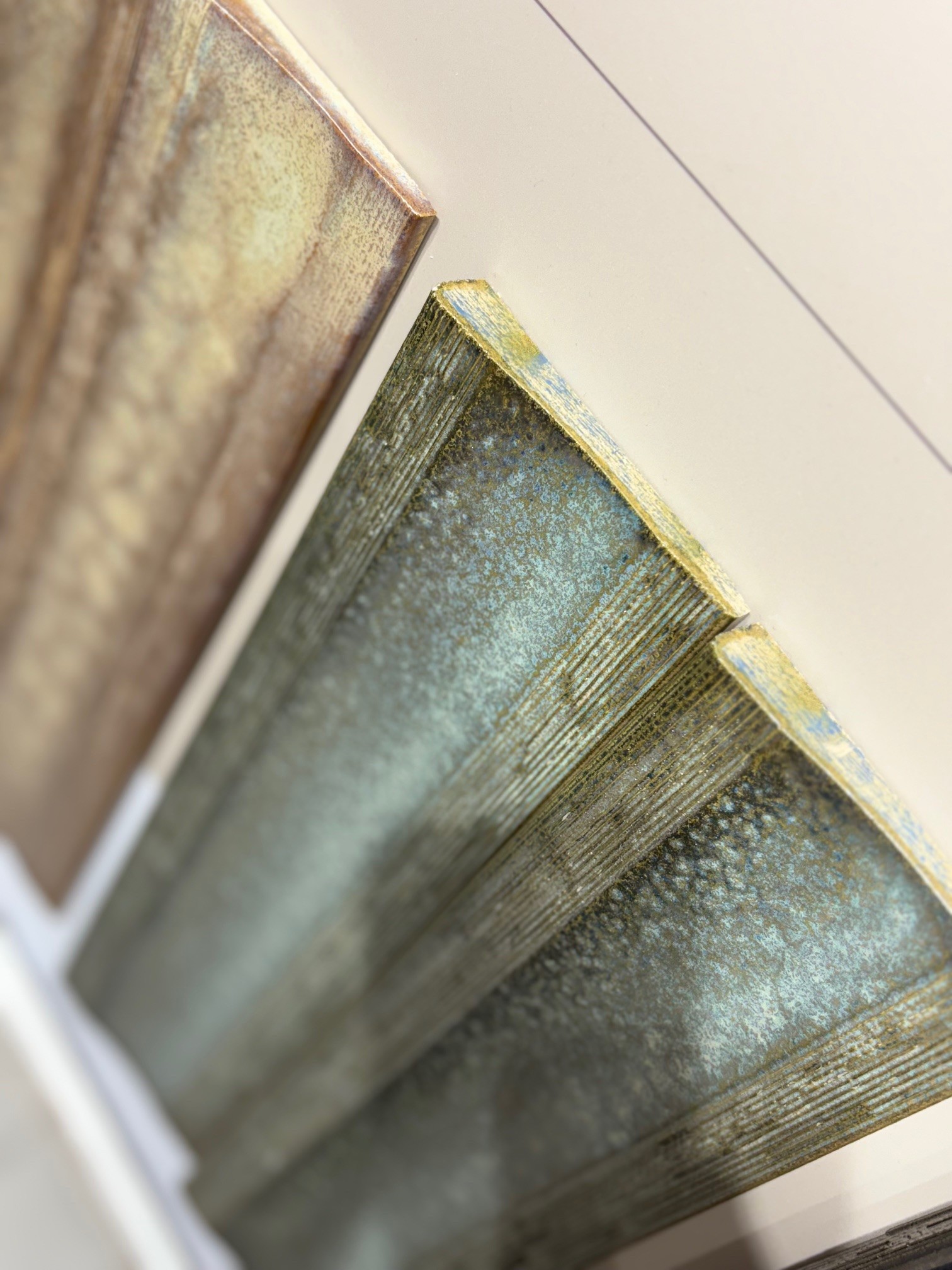 Relieffer, tredimensjonale profiler og matte glasurer tilfører rommene dybde og fysisk nærvær. Lyset brytes, skygger oppstår, og flatene får en levende karakter som endrer opplevelsen gjennom dagen.
